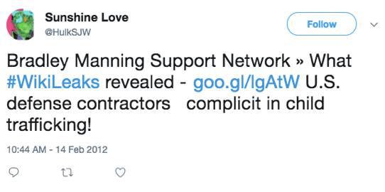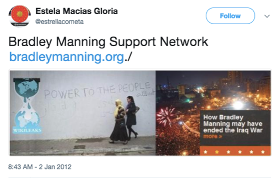L’histoire vraie est sur le timeline Twitter de WikiLeaks. Depuis le jour même où Manning, après avoir été trahie sans pitié par Adrian Lamo, un agent du FBI, a été arrêtée :