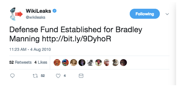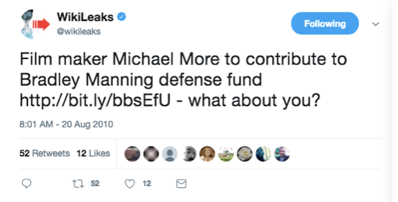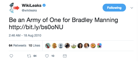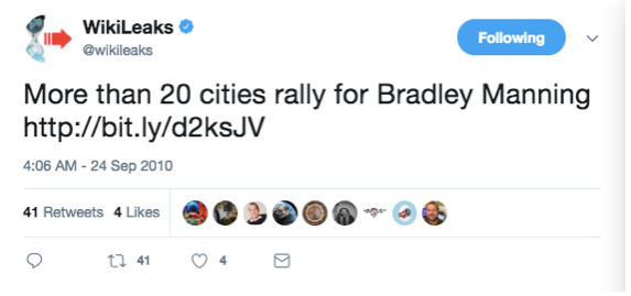 Quelque chose que je n’ai encore jamais vu quelqu’un d’autre arriver à faire : même la fameuse semaine de fin août 2010 où Julian Assange était en train de subir ses propres attaques contre la loi et la diffamation publique, WikiLeaks était toujours en train de tweeter sans relâche des annonces de soutien à Manning :
