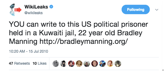 Quelques jours après son arrestation, WikiLeaks avait lancé la première campagne de lettres en faveur de Manning – alors qu’elle était encore dans une cage au Koweït :