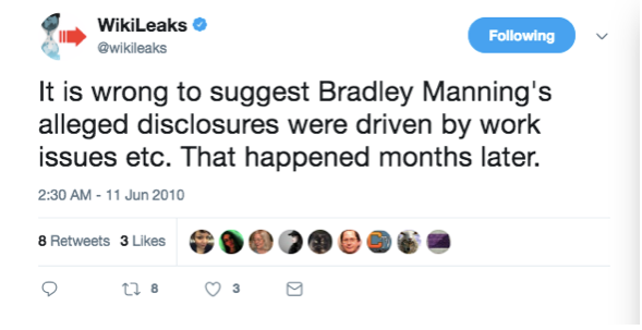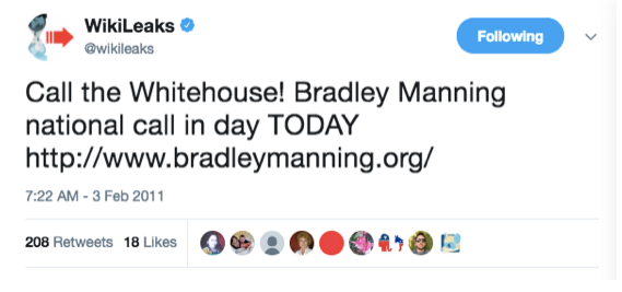 …trois semaines après que WikiLeaks eut coordonné les appels à la Maison Blanche pour la libération de Manning :